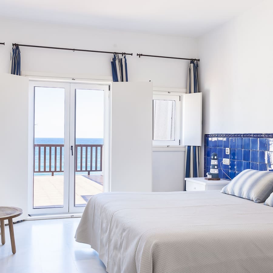 Very spacious, bright rooms with detailed decoration. These rooms have a large shared terrace with a frontal view of the sea. They have a double bed or two single beds of 1.90 x 2.00 m.